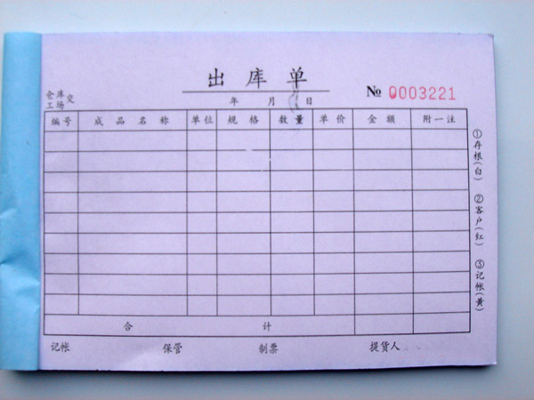 二、票據(jù)聯(lián)單印刷用的什么紙? 票據(jù)聯(lián)單印刷表面用紙是牛皮紙、內(nèi)頁用紙是無碳原漿復(fù)寫紙,無碳復(fù)寫紙是一種隱色復(fù)寫紙,能夠直接復(fù)寫,它主要是在外力作用下,使微膠囊中的力敏色素和油溶液溢出與顯色劑接觸后發(fā)生染色反應(yīng),從而起到復(fù)寫的作用。無碳復(fù)寫紙可分為他顯色和自顯色兩種,按紙的顏色分有紅、黃、綠、藍(lán)、白五種;按顯現(xiàn)的色跡分有藍(lán)、黃、橙、黑、紅等顏色,票據(jù)聯(lián)單分為手寫聯(lián)單和機(jī)打聯(lián)單,手寫聯(lián)單通常用55g的無碳復(fù)寫紙,機(jī)打的以三聯(lián)票為例:一層用48g、第二層用50g、第三層用48g的無碳復(fù)寫紙。 |